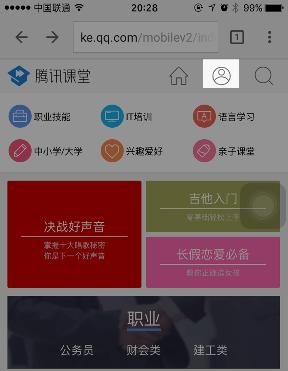 c) 用手机浏览器访问腾讯课堂官网(Ke.qq.com),点击右上角个人中心图标,登录查看已注册的课程。