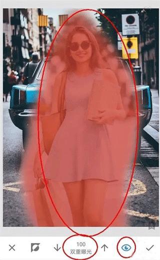 7、进入蒙版后,注意看参数。此时双重爆光的参数,是100,用画笔在图片上进行涂抹后,涂抹了的区域就显示了人物了。说明当我们用双重曝光数值100去涂抹图片时,图片就会显示后面添加的人物图片,反之如果双重曝光参数为0时再去涂抹,那么图片就会再次显示背景为车的效果。