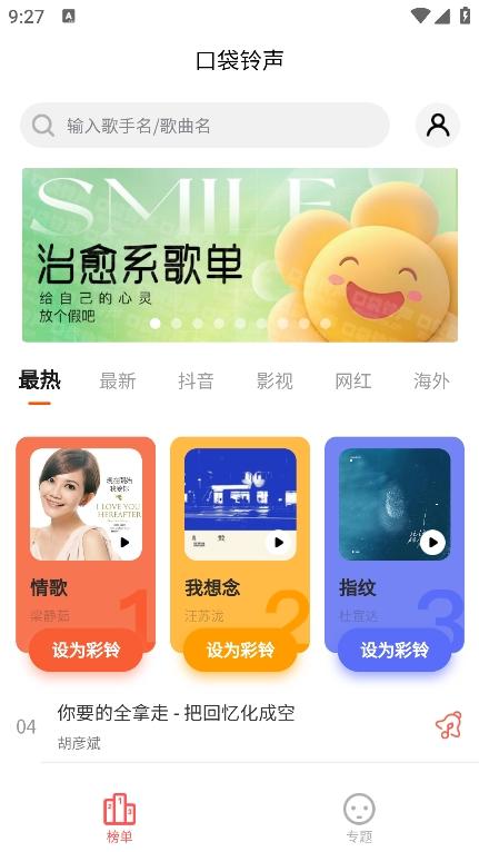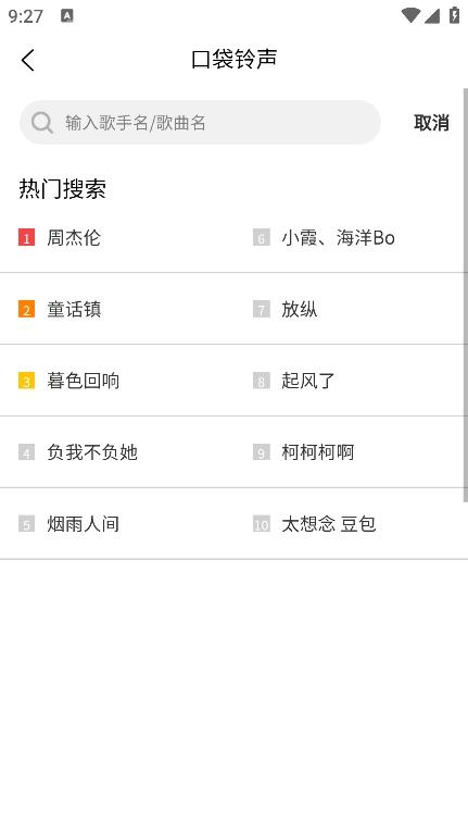 2、我们可以搜索歌手或是歌曲名称来发现铃声,还有热门搜索展示;