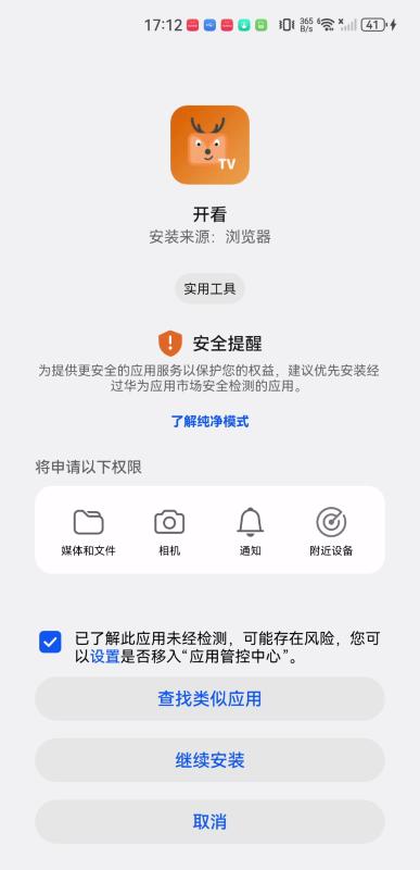 3、点击勾选“已了解此应用未经检测……”,点击“继续安装”。