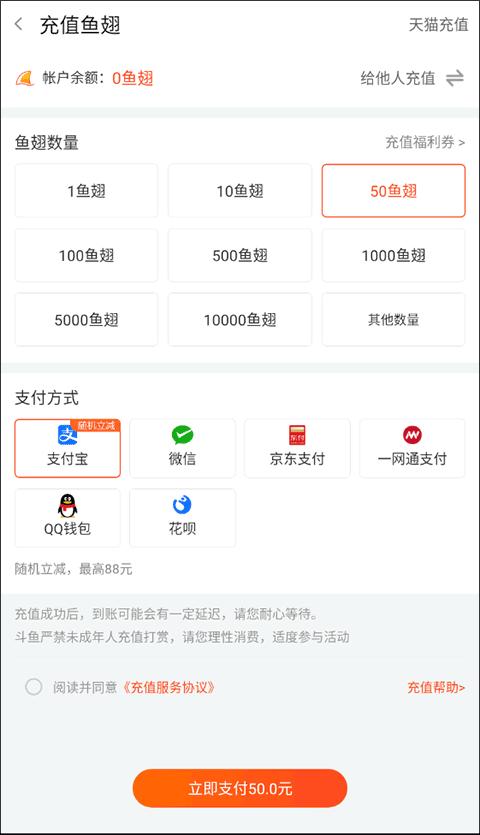 2、在充值鱼翅界面选择好鱼翅数量、支付方式后找到并点击“立即支付”选项;
