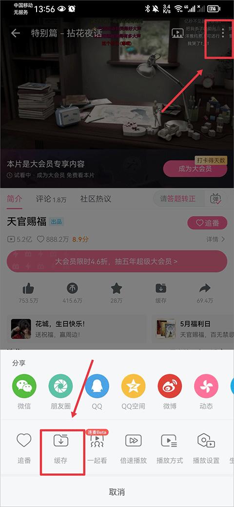 在动画观看界面中点击右上角三点后,在点击下方缓存按键
