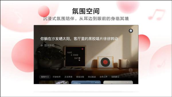 此次新增“氛围空间”功能,能在用户聆听音乐同时,电视屏幕展示各类主题背景画面,营造身临其境的沉浸式体验,如“躺在沙发晒太阳”“守在冬日暖炉边”。
