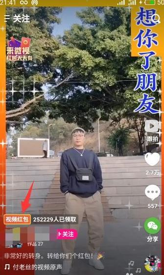 2、打开之后,刷视频注意看到有,左下角视频红包的样式的才会会有红包。