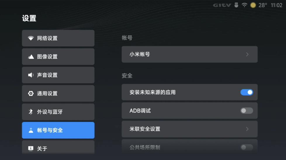 一、在小米/红米电视中打开“电视设置”,选择“账号与安全”,选择允许安装未知来源的应用。
