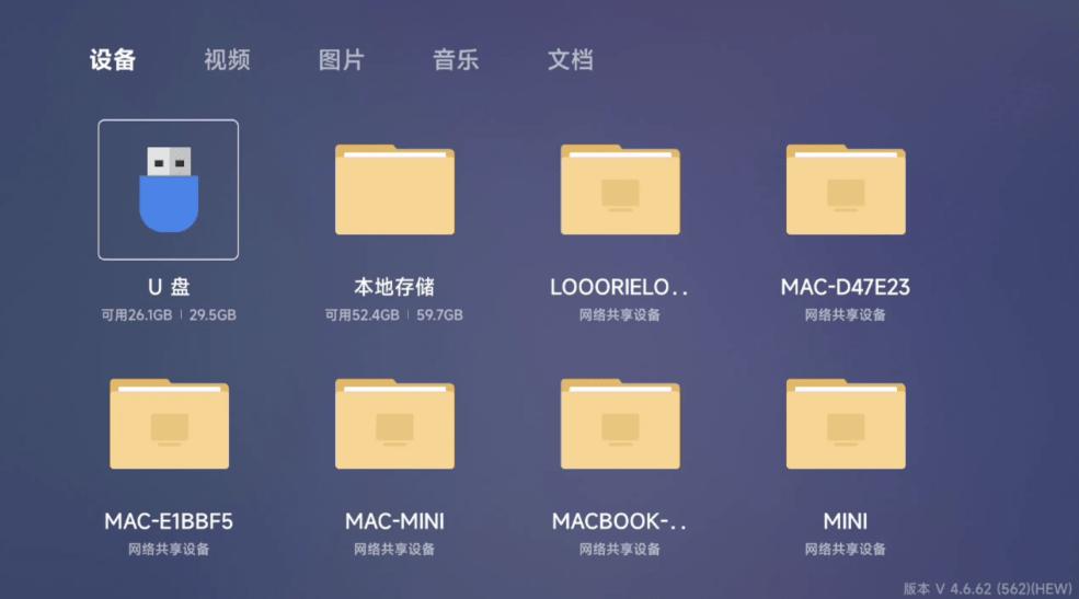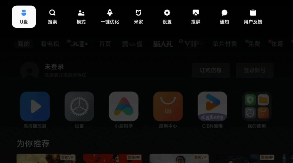 如果未弹出,可在电视首页最顶部,按“上”键,找到U盘。