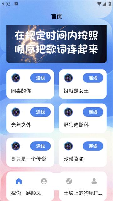 首页:选择一首歌然后在规定的时间内把歌词的顺序连接起来;