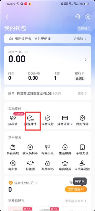 3、进入钱包后,点击抖音月付