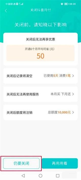 7、进去之后,点击关闭,就成功关闭抖音月付了,根据需要使用。