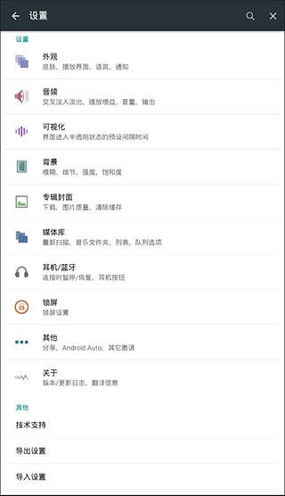 5、下图是设置页面,你可以进行软件的自定义设置,例如外观、音频、可视化、背景、专辑封面、媒体库、耳机/蓝牙、锁屏等。