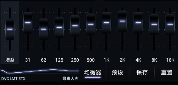 三:第三个均衡器我称之为“最毒人声”,之所以称之为最毒人声,就是因为这种均衡器设置的中频人声特别突出,但是,这个均衡器设置的三频又十分的均衡,同样的清丽通透,听感十分舒服,使人久听不累。从左至右开始:增益:0;第一频段:+4;第二频段:0;第三频段:+1;第四频段:+2;第五频段:+3;第六频段:+4;第七频段:+5;第八频段:+4;第九频段:+3;第十频段:+3