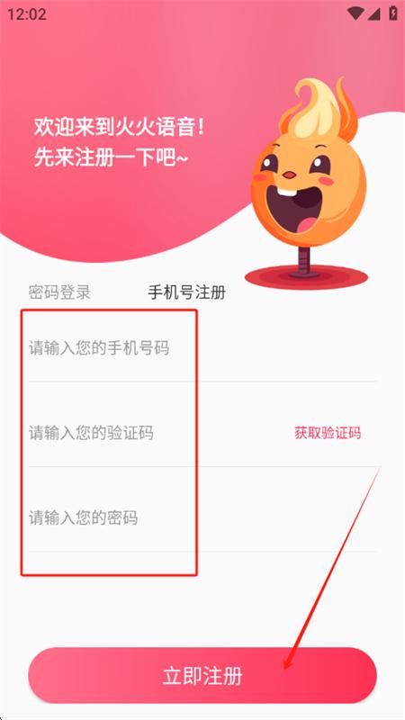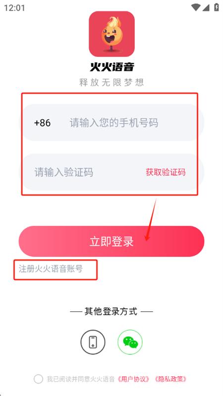 3、输入手机号和验证码可以快速登录,没有的点击注册火火语音账号