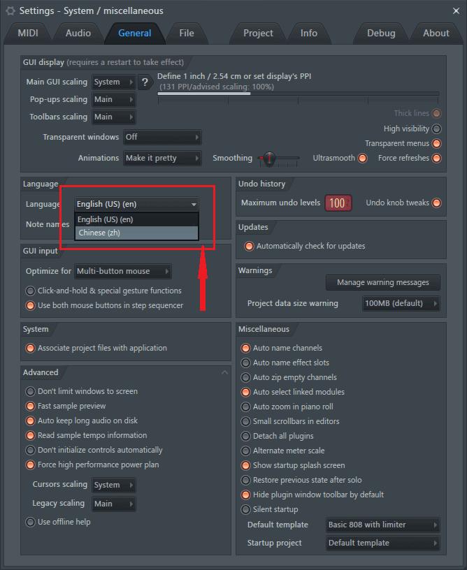 2、这里是调整FL Studio的常规设置的面板,在图中红框框出来的那里选择“Chinese(zh)”