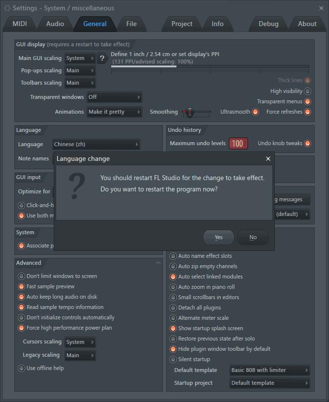 3、随后FL Studio会弹出一个提示,大致意思是FL Studio需要重启以应用刚才的修改,这里我们直接点击“Yes”即可。