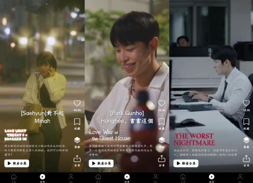 在“搜寻”页面中,布局采用了上滑下滑的模式,右下方几处功能键依次为喜欢、收藏、集数和分享。在这一页面中,笔者上下滑动了多次,每次滑动几乎没有重复的题材,这一点对于那些有“猎奇”心理、对短剧较为好奇的用户来说能够产生一定的吸引力;对于韩国本土用户而言,这些惊悚、恋爱、婚外情、犯罪等题材则非常契合他们的观看倾好,同样便于快速上手。