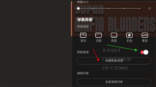 在右侧弹出的弹幕设置页面中,开启弹幕屏幕管理(下图绿色箭头所指),并点击【弹幕屏蔽管理】(下图红色箭头所指)