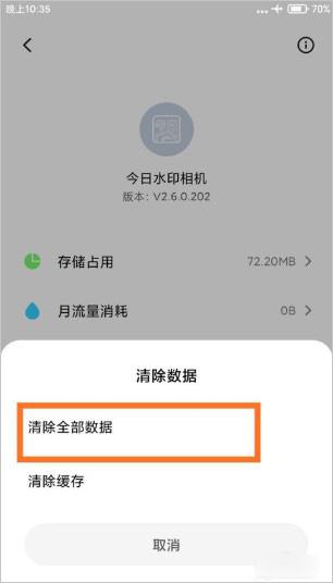 1、首先我们需要手机处于飞行模式,打开手机设置选择“应用设置”确定“应用管理”,点击“今日水印相机”选择下方的“数据清除”,确定“清除全部数据”。