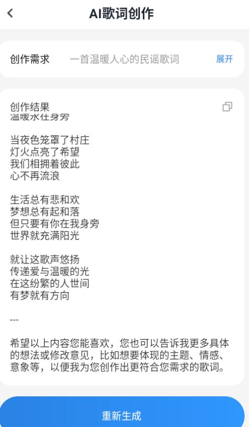 创作灵感:根据用户的输入,AI不仅能提供歌词生成,还能帮助用户在创作过程中找到新的思路和灵感。