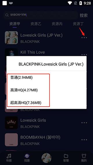 2、就可以发现歌曲,比如搜索BLACKPINK,可以看到有甲乙丙丁多个资源;