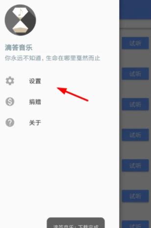 2、点击歌曲图标后,可以通过下方的列表选择音质,直接进行下载。如果想找到已下载歌曲的位置,可以通过左上角的按钮打开列表,选择“设置”功能。