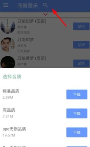 1、用户可以在上方的搜索栏中输入关键词,找到自己感兴趣的歌曲进行试听或下载。