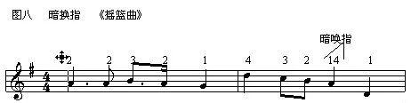 两音之间音域较宽时,出于对乐句流畅的要求,采用的一种指换但音不断的弹奏方法。采用这种指法时需注意的是,换指时所按的那个音的时值不宜过短。如: