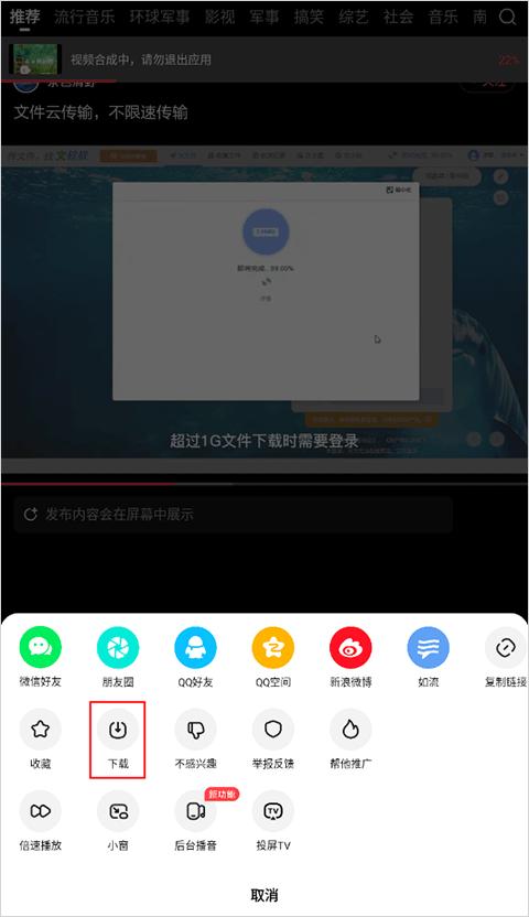 1、同样是点击视频对应的“分享”图标,在窗口中选择“下载”即可。