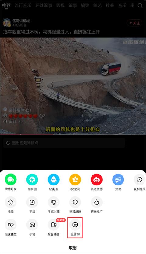 2、点击视频对应的分享图标"↗“按钮,选择投屏tv即可。