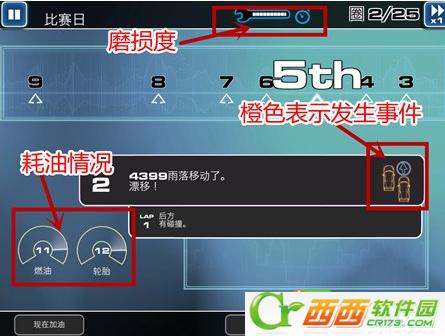 比赛开始后,赛车过程主要通过如图这样的名次变化进行展示,当出现橙色图标表示将有事件发生,要做好操作的准备;左下方是我们耗油情况,在快消耗完的时候点击加油快速补充。撞车会导致磨损度下降,全部被破坏的时候赛车就报销了。